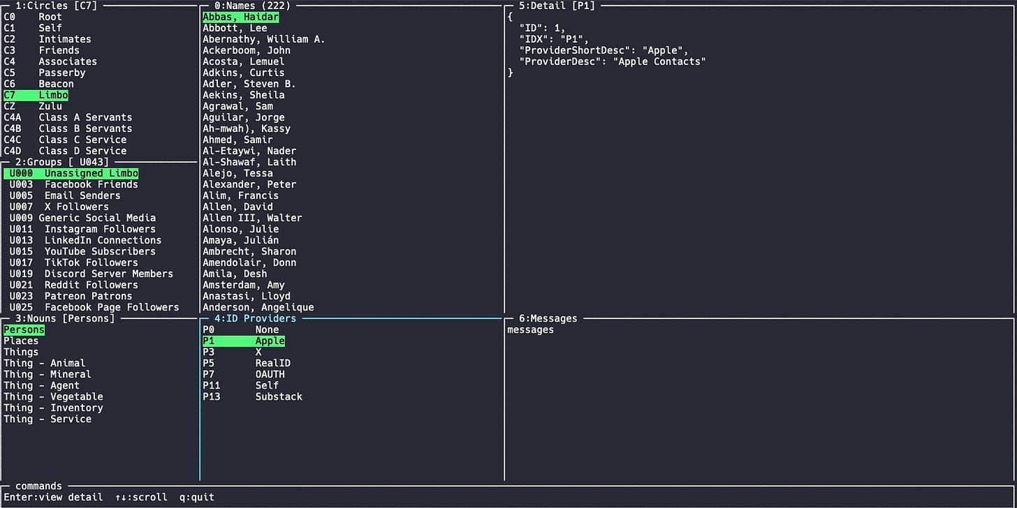 There’s a lot to say about this, but I’ll keep it brief. I have to relearn Blackmagic DaVinci Resolve to edit the demo video; iMovie doesn’t cut it. What you can see is that I have a bunch of contacts in Limbo (C7) which is the lowest level of trust. These are populated after an import of Apple Contacts and they await me sending them to a new level of trust. In the CLI you pick a name in the Names frame then click or arrow to a Circle level and assign them there.